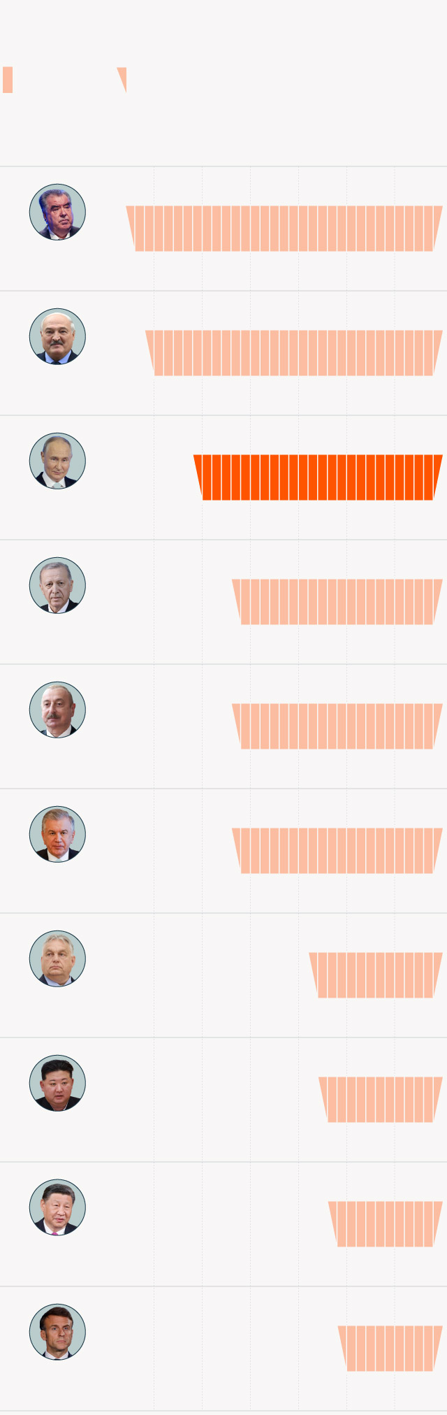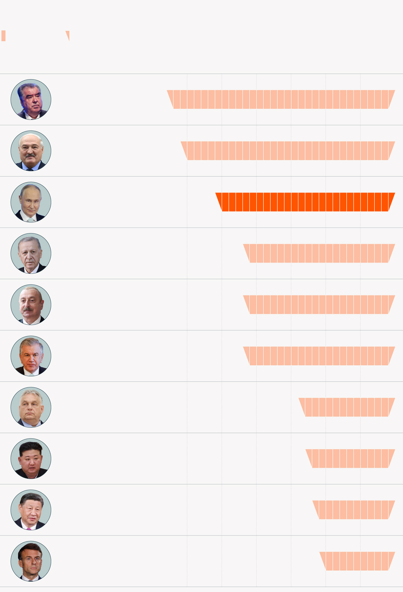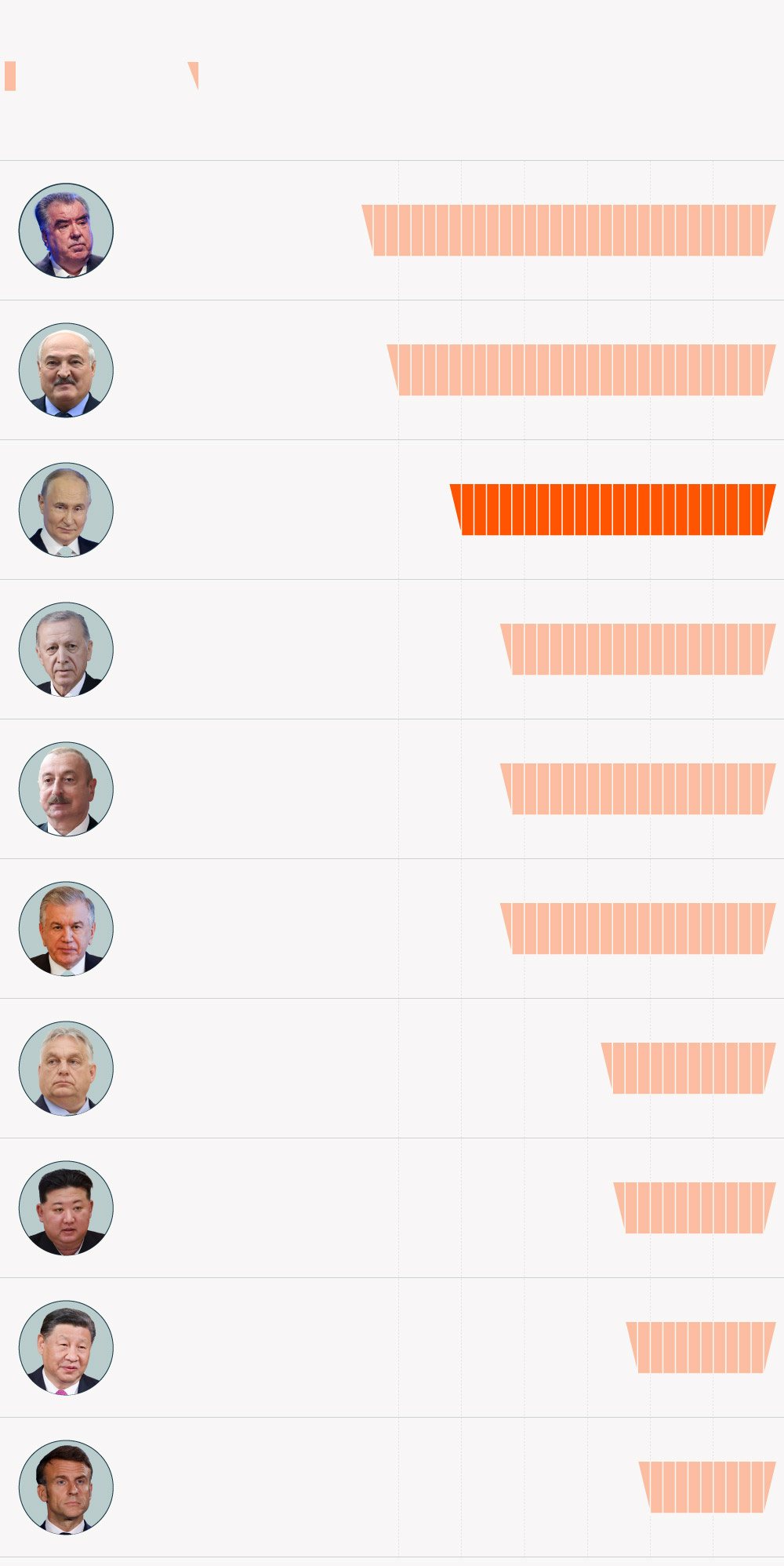 Давраи раҳбарии Владимир Путин, раиси ҷумҳури Русия ва ҳамтоёни ӯро аз чанд кишвари дигари дунё дар ин феҳраст бинед ва муқоиса кунед. Кӣ бештар дар сари ҳукумат аст?