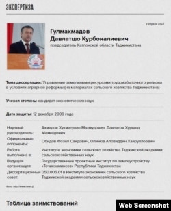 Пойгоҳи “Диссерент”, ки зидди тақаллубкорӣ ва плагиат матлаб нашр мекунад, Давлатшоҳ Гулаҳмадзода, раиси вилояти Хатлонро ба асардуздӣ муттаҳам кард. Гулаҳмадзода, ки аз соли 2013 раиси вилояти Хатлон аст, соли 2009 дар мавзӯи “Идораи раёсати заминдорӣ дар минтақаи дорои захираи фавқулодаи корӣ” рисолаи номзадӣ ҳимоя кард. Номзади илмҳои иқтисодист.