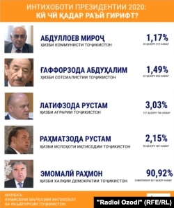 Комиссияи марказии интихоботи Тоҷикистон эълон кард, ки раиси ҷумҳури феълӣ Эмомалӣ Раҳмон дар интихоботи рӯзи 11-уми октябр 90.92 дар сади раъйи мардумро ба даст оварда, пирӯз шудааст.