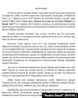 Вокуниши Кумитаи дин рӯзи 7-уми апрел дастраси Радиои Озодӣ шуд. Дар он омадаст, ки "мақоми ваколатдори давлатӣ дар соҳаи дин барои бозсозии масҷиди панҷвақтаи деҳаи Хушободи шаҳри Исфара зид нест."