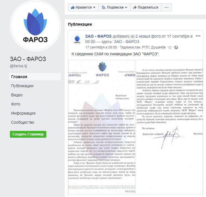 Эълони расмии “Фароз” дар бораи барҳам додани ширкат. Моҳи сентябри соли 2019